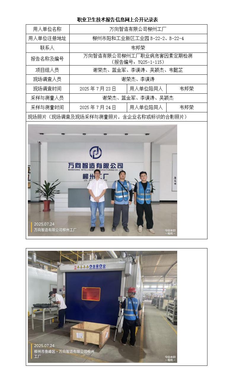 萬向智造有限公司柳州工廠職業(yè)病危害因素定期檢測(cè) (報(bào)告編號(hào):YQ25-1-115)