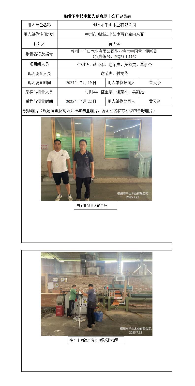 柳州市千山木業(yè)有限公司職業(yè)病危害因素定期檢測